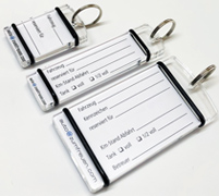 Fahrzeug-/Fahrerdaten bei Bedarf einfach und schnell von Hand eintragen, Kärtchen mittels Perforation abtrennen, zwischen die beiden Acrylplatten legen, O-Ringe aufziehen, Schlüsselring dran, FERTIG!Video ansehen >