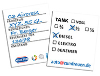Die Vorderseite wird firmenbezogen oder im KFZ-Marken-CI gestaltet über den Office-Drucker vorgedruckt.