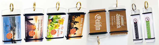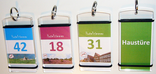 Schlüsselanhänger für Hotels bieten wir in drei Standard-Formaten (Scheckkarte, elegant länglich und kompakt).